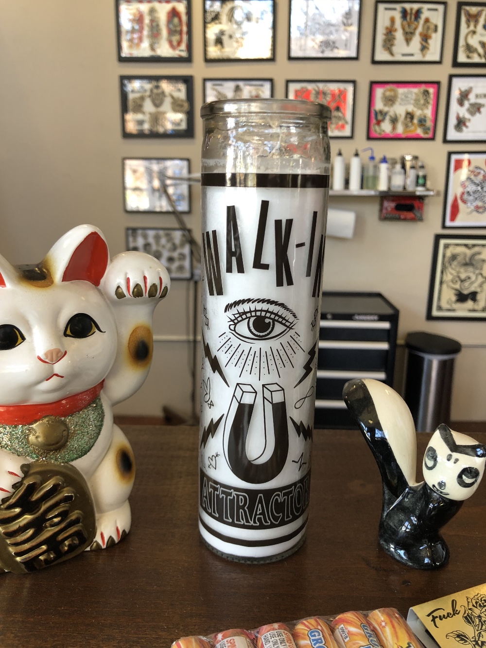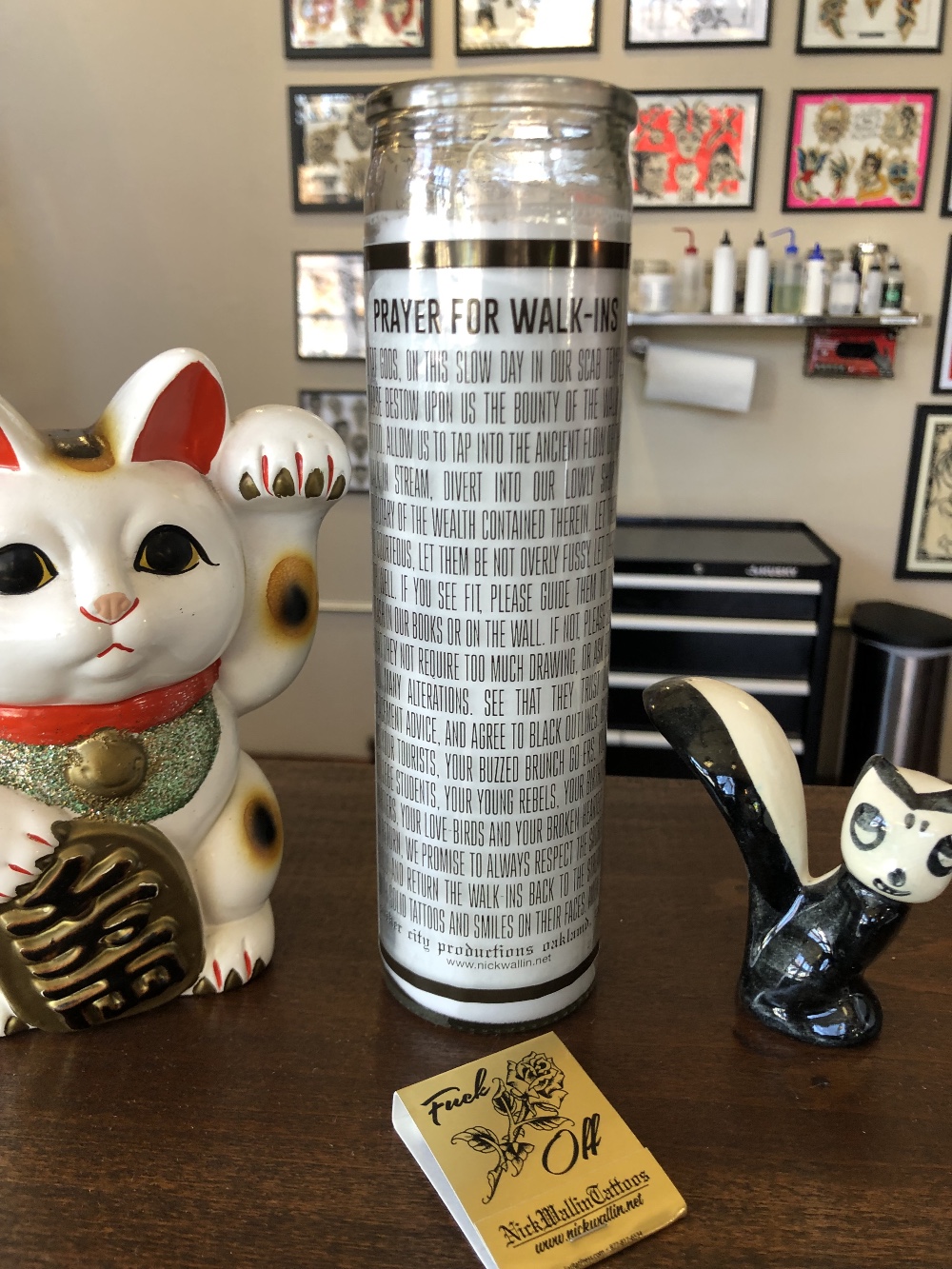 A prayer candle for those slow days at the scab-temple. “Guaranteed” to work if used properly. Comes with special magic matches. Available in red or white.