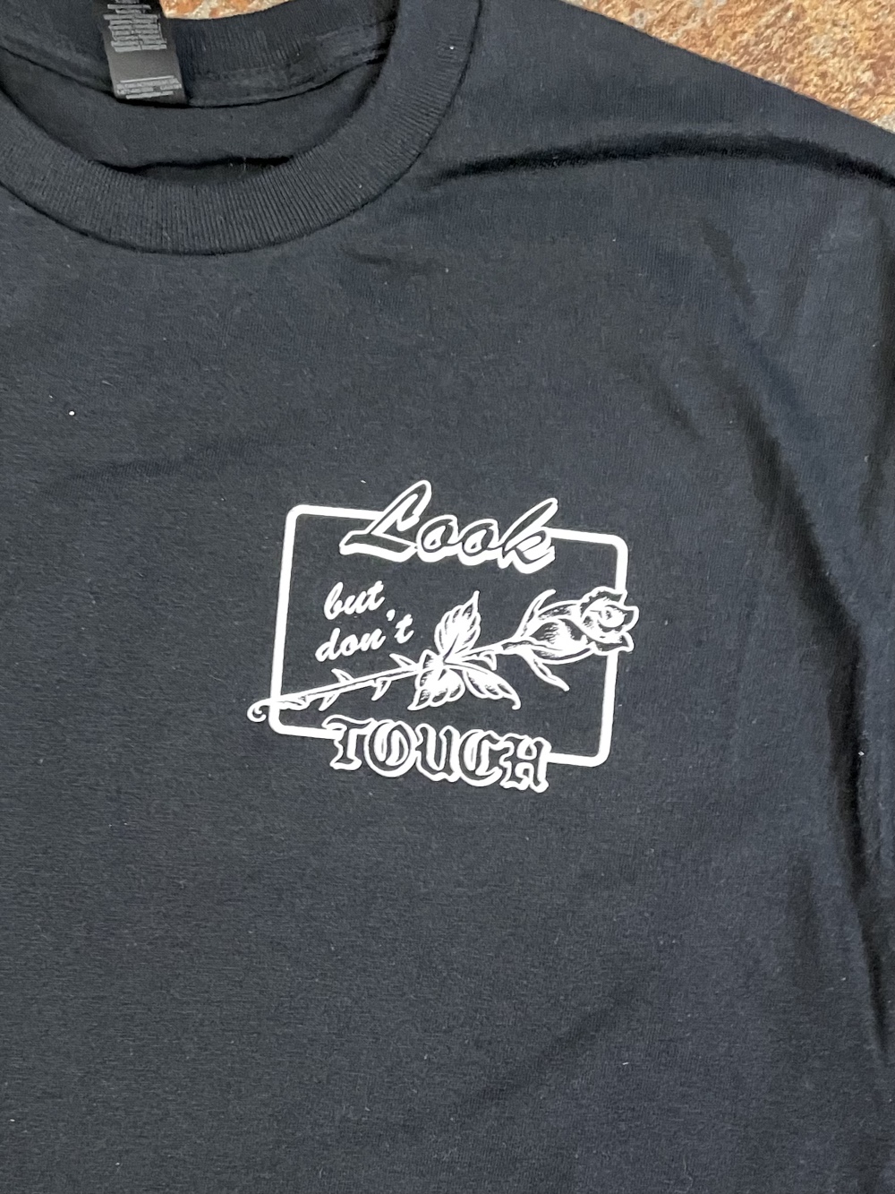 Let everyone know they can Look but not Touch. Hand silkscreened in Oakland on 100% cotton T-shirt. Local pickup available at True Love Tattoo in Berkeley, CA, double check your shipping options before checking out.